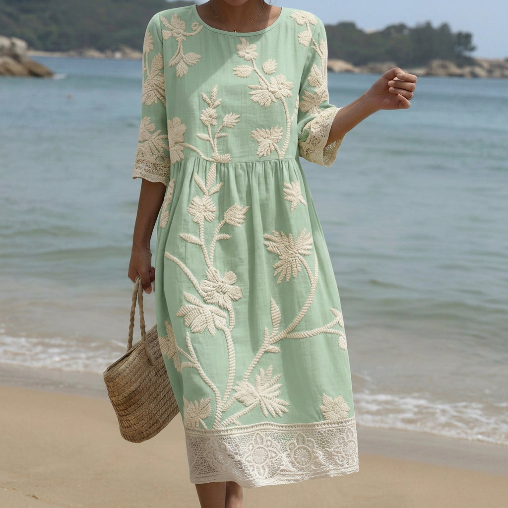 Entre na primavera e no verão com este vestido midi lindamente estampado. Ele flui graciosamente para um ajuste fácil e lisonjeiro, perfeito para saídas diárias, fins de semana relaxados ou dias de férias. A delicada estampa de plantas e flores adiciona um toque de sofisticação alegre ao seu guarda-roupa.