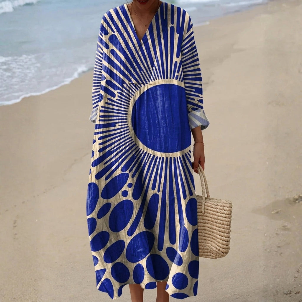 Radiante. Original. Livre. O vestido Denise captura a energia do verão com o seu espetacular padrão azul em forma de sol sobre um fundo creme. O corte solto e o tecido leve tornam-no uma escolha perfeita para um dia relaxante na praia ou um passeio elegante pela cidade. Uma homenagem à liberdade, movimento e criatividade.