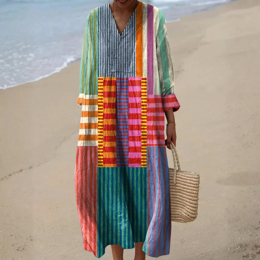 Traga alegria ao seu guarda-roupa com o Eva - Vestido Longo Multicolorido em Patchwork. Esta peça única atrai todos os olhares e oferece o máximo conforto para os seus dias relaxados ou criativos.